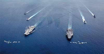 (남중국해에서 훈련 중인 미 항모 니미츠호와 레이건호. 사진 출처=US Navy.com)